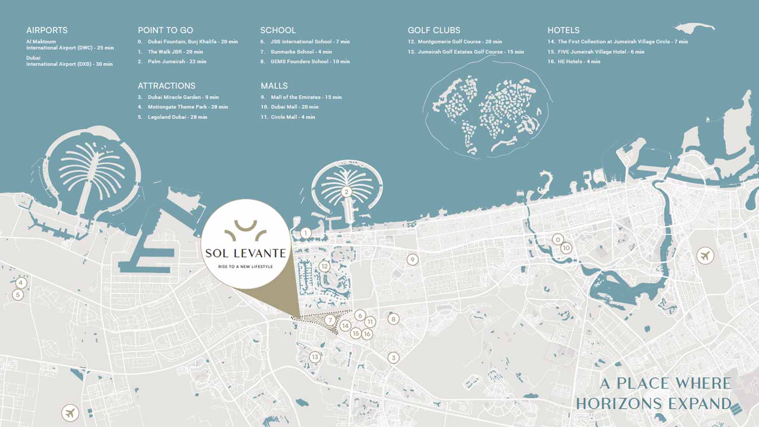 SOL Levante is positioned within Jumeirah Village Triangle, a fast-growing community known for its suburban charm and urban accessibility. The project offers easy access to: